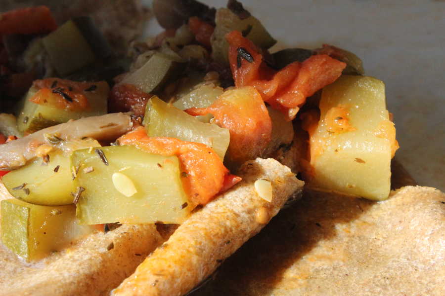 Végétarienne tomates cuisinées, courgette, champignons, chèvre