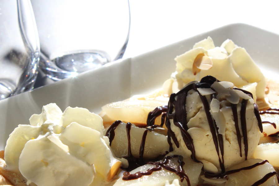 Belle Hélène poire caramélisée, glace vanille, chocolat maison, chantilly, amandes